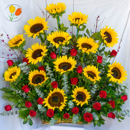 Hermoso arreglo floral elaborado con 15 girasoles grandes y 24 rosas rojas en canasta jardinera.