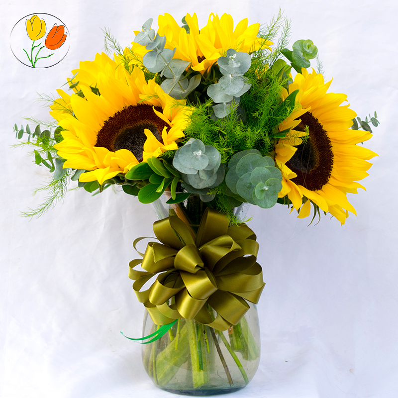 5 girasoles en jarron de vidrio a domicilio en CDMX: Azcapotzalco, en EdoMex: Atizapan de Zaragoza, Nicolas Romero, Isidro Fabela, Cuautitlán Izcalli, Naucalpan, Tlalnepantla