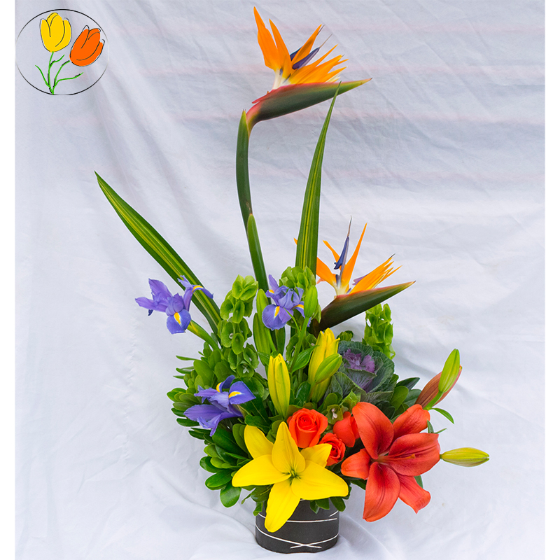 Arreglo floral con ave de paraiso lilis y rosas elaborado en base de barro artesanal.