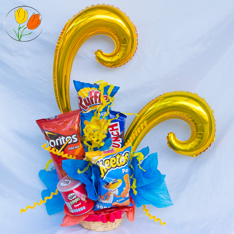 Linda canasta mini con botana y globos.