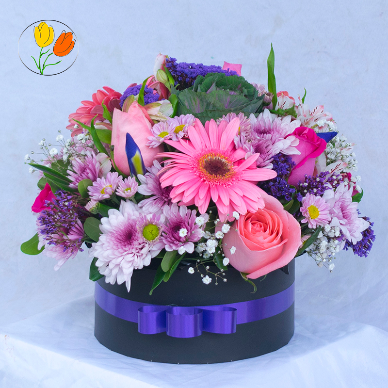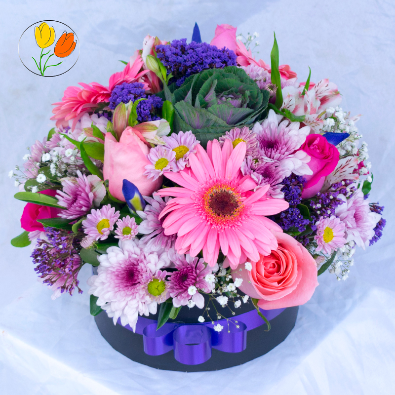 Hermosa Caja con flores rosadas, caja de cartón rigido con flores de temporada rosadas.