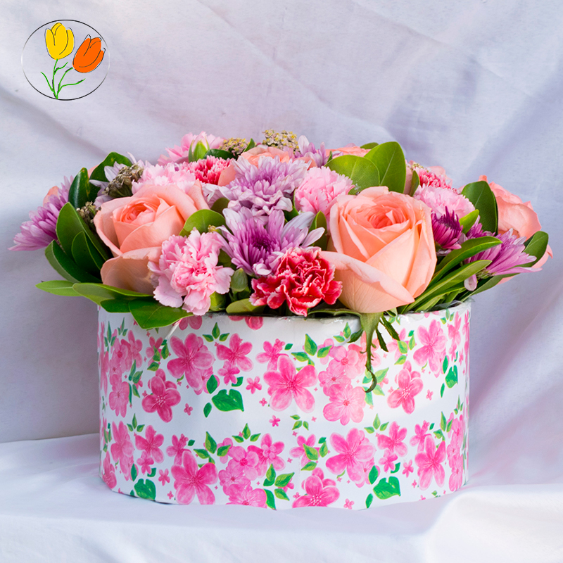 Hermosa caja vintage con flores de temporada en colores rosados. El color y diseño de la decoración de la caja sujetos a disponibilidad.