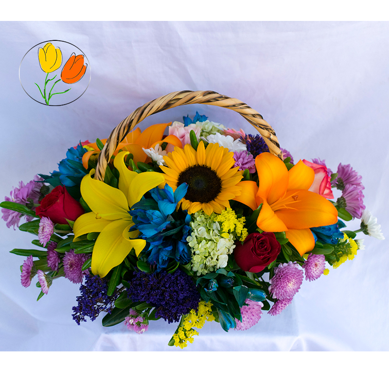 Arreglo floral primaveral chico en canasta rectangular con flores de temporada: rosas, alstroemerias, lilis, gerberas, morelianas, rosa baby.