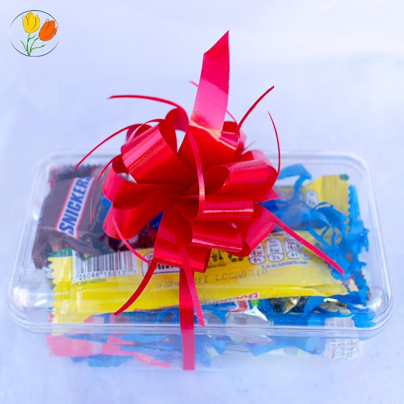 Cofre de acrílico con dulces, chocolates y picositos.