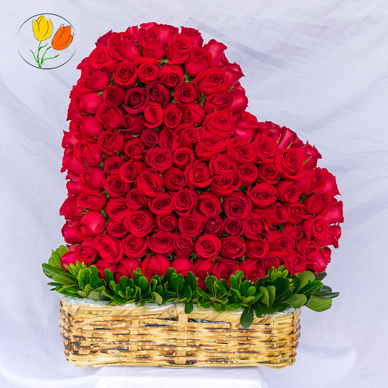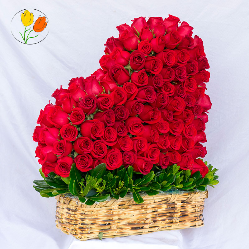 Corazon gigante 200 rosas: es un arreglo con rosas rojas en forma de corazón elaborado en una canasta.