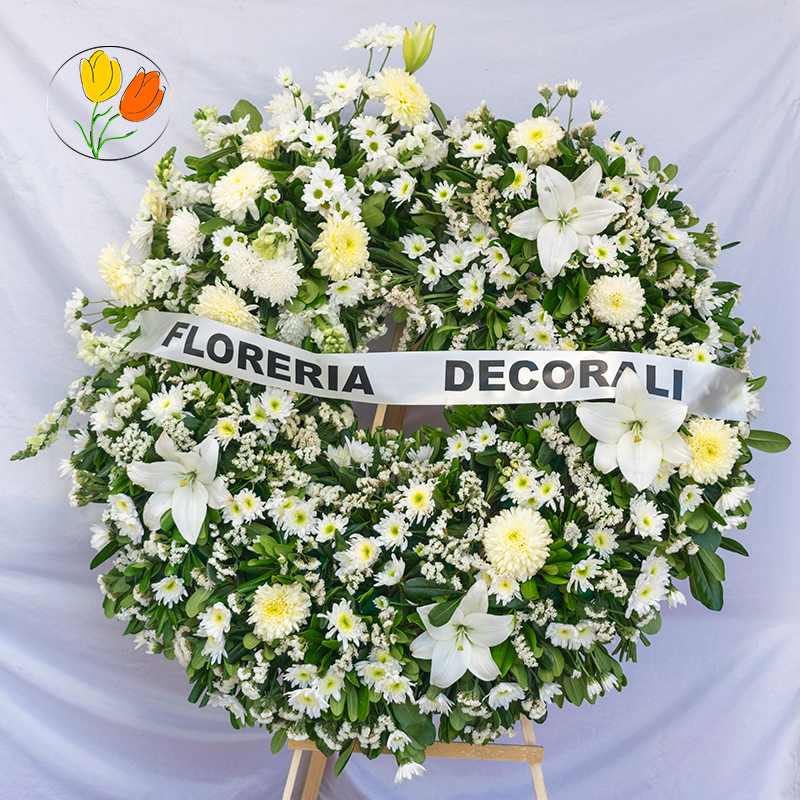 Hermosa corona floral funebre de 85cm de diametro con flores blancas, incluye liston.