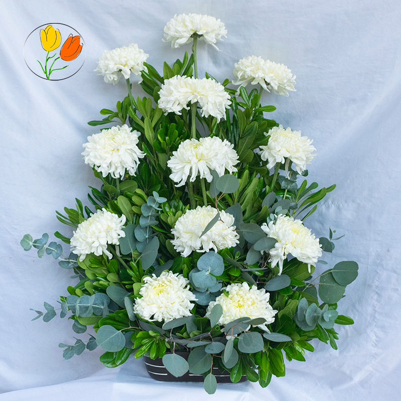 Hermoso arreglo floral funebre de una vista elaborado con crisantemos en una base de barro.