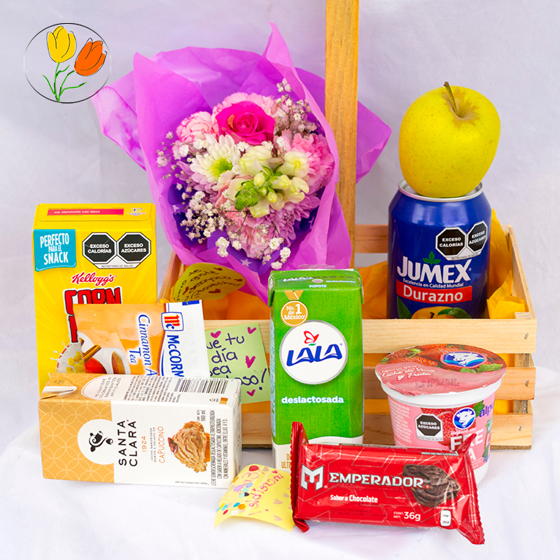 Hermoso detalle en huacal con letrero personalizado para esa persona especial, el desayuno sorpresa incluye: Detalle floral, Jugo jumex de lata, 1 fruta de temporada, yogurth, leche de sabor, galletas mini, sobres de té, cereal y leche individual.