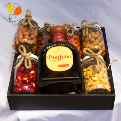 Hermoso regalo con Tequila Don Julio reposado de 700ml y 6 frascos con botanas saladas en elegante caja de madera.