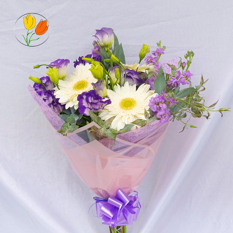 Lindo ramo redondo con gerberas, lisianthus, matiolas y eucalipto.