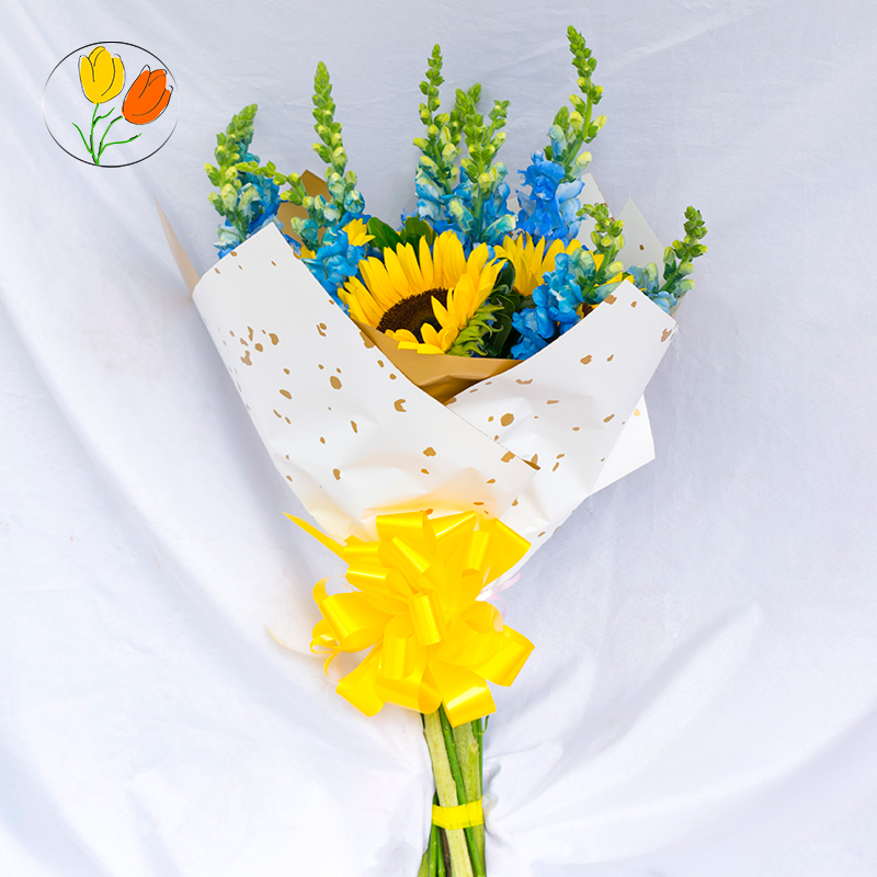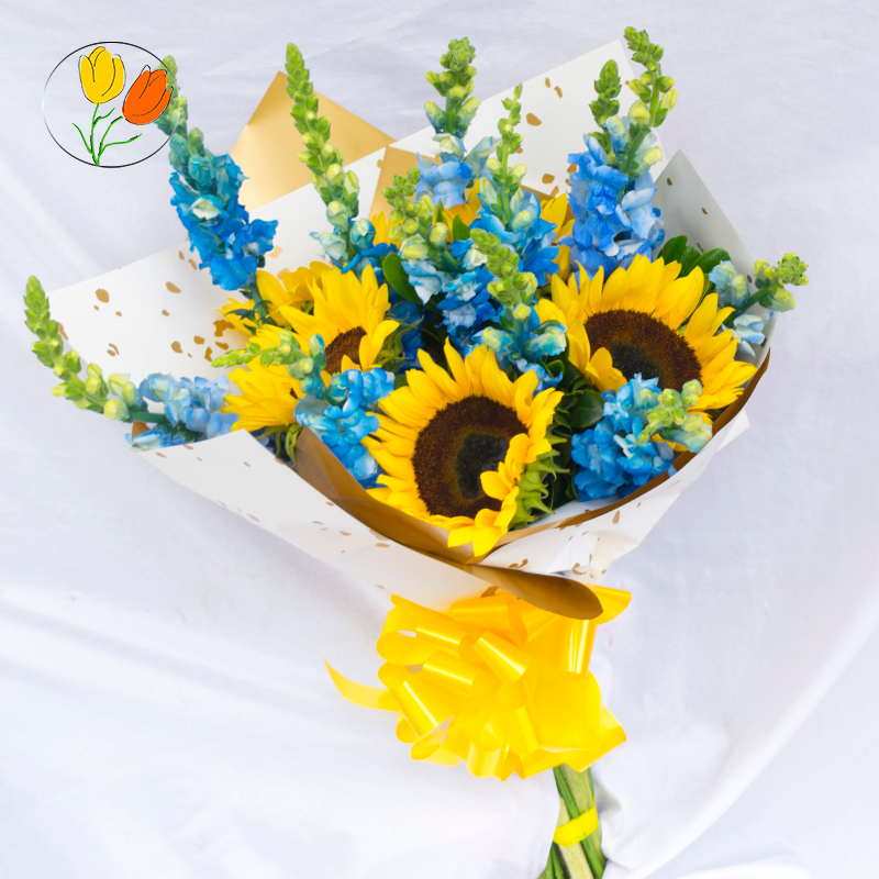 Lindo ramo redondo atado a mano de girasoles grandes y perritos pintados de color azul.