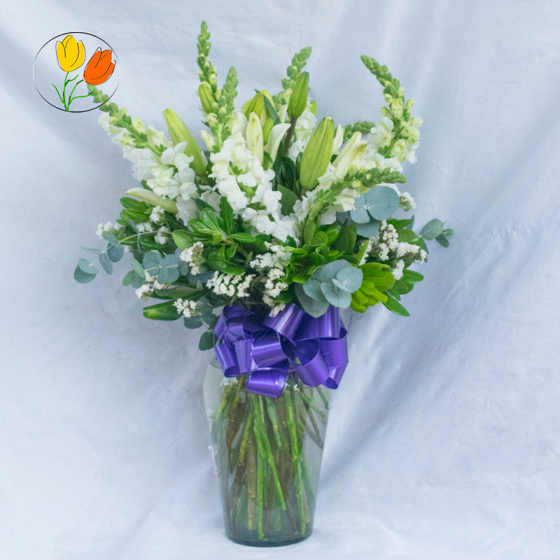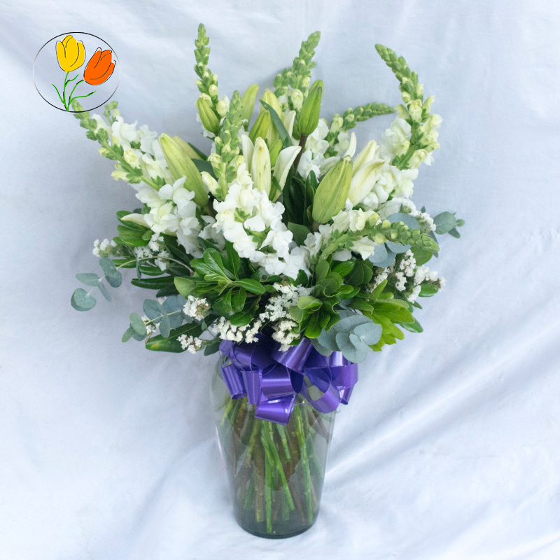 Hermoso arreglo floral funebre con lili y peritos en jarron de vidrio