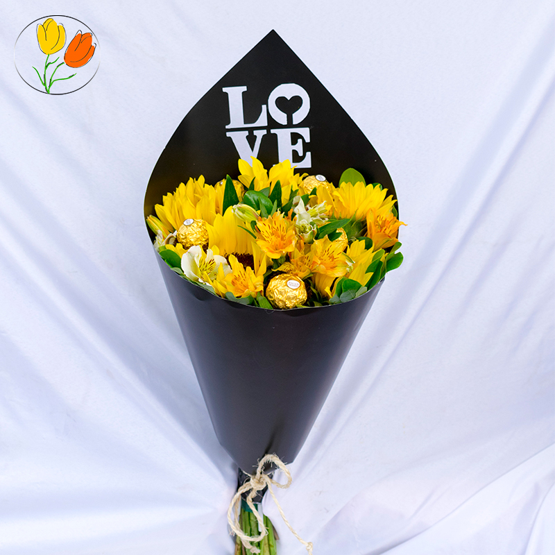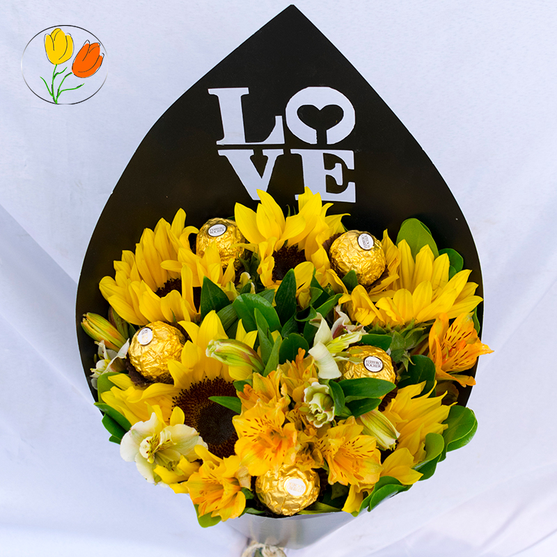 Lindo ramo de girasol mini, alstroemerias y chocolates ferrero rocher en cono LOVE.