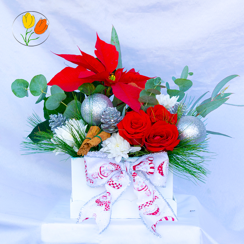 Hermoso arreglo floral con nochebuenas, rosas, esferas, canela y elementos navideños elaborado en una caja.