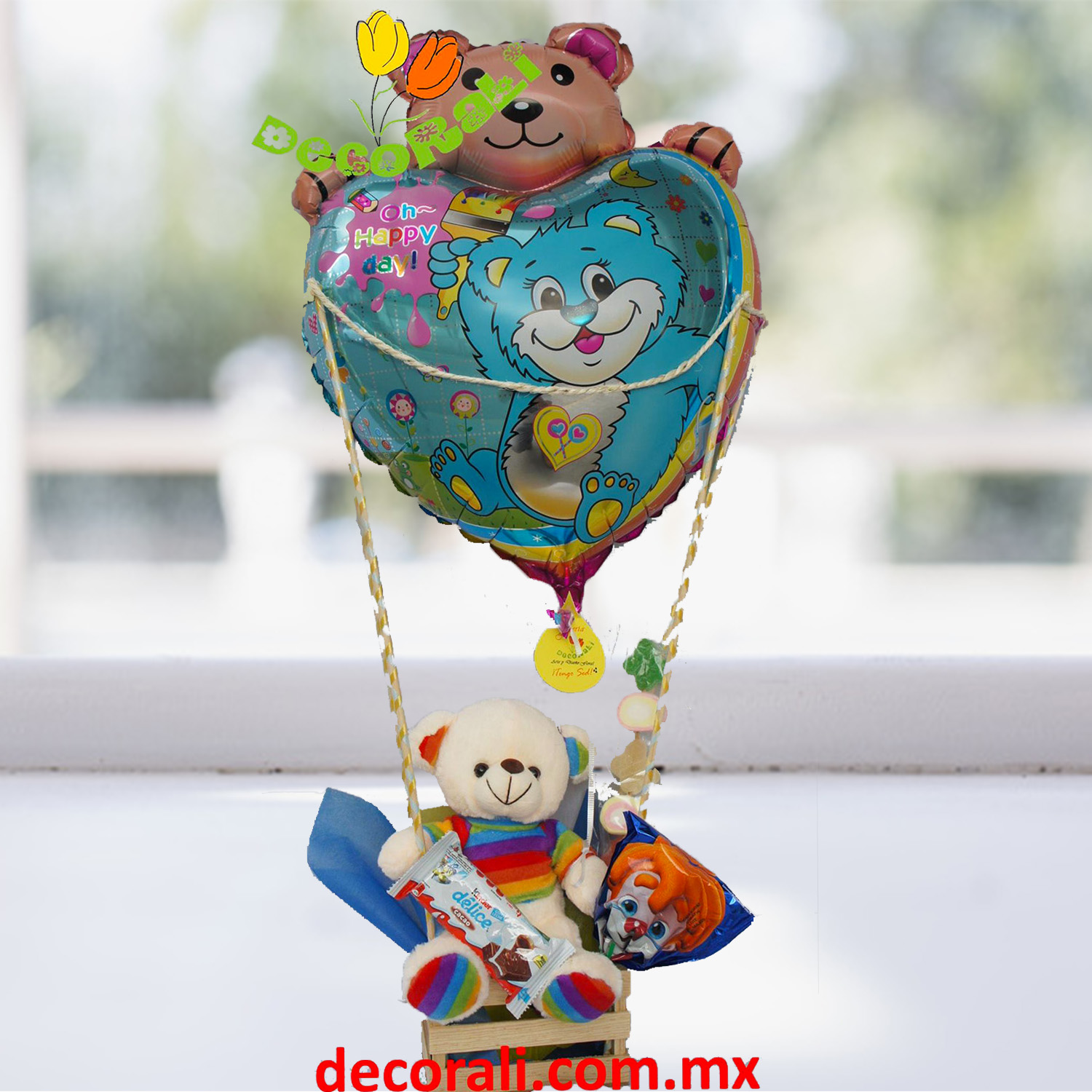 Globo aerostático de juguete con peluche y dulces.