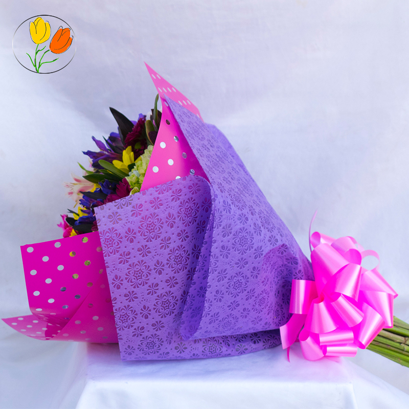 Hermoso ramo atado a mano con flores de temporada y papel premium decorado.
