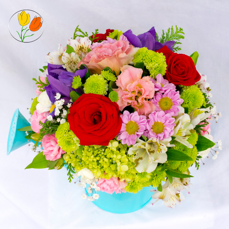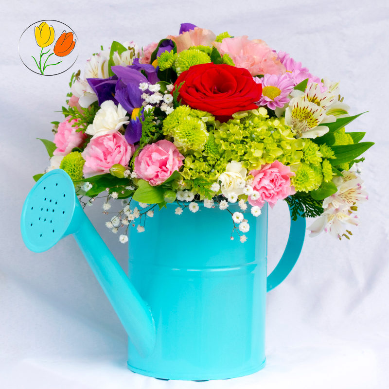 Hermoso arreglo floral con flores de temporada elaborado en regadera galvanizada pintada.
