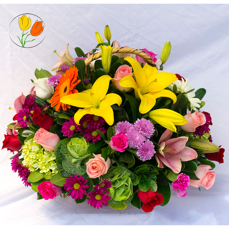 Arreglo redondo de rosas, lilis y flores multicolor de temporada en canasta.