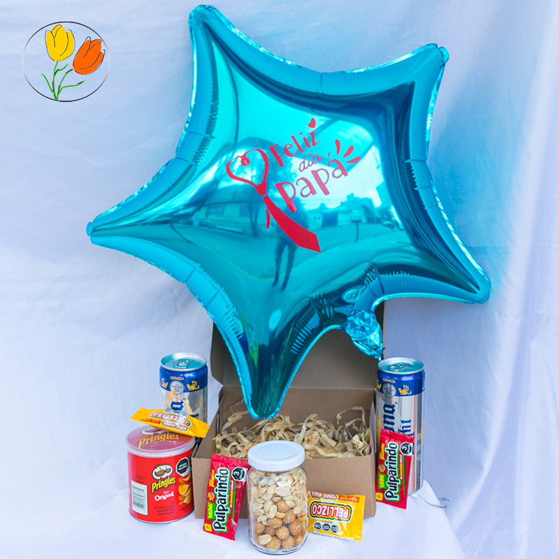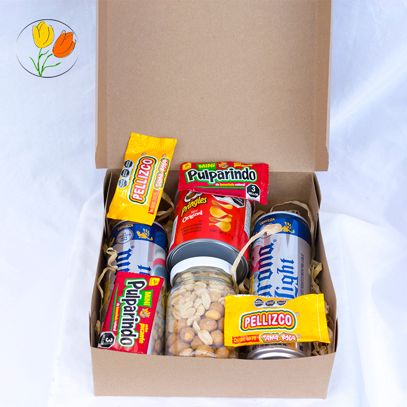 Hermoso detalle en caja de cartón, incluye un par de cervezas de lata, papas pringles chicas, frasco con cacahuates, dulces picosos y globo metálico personalizado.