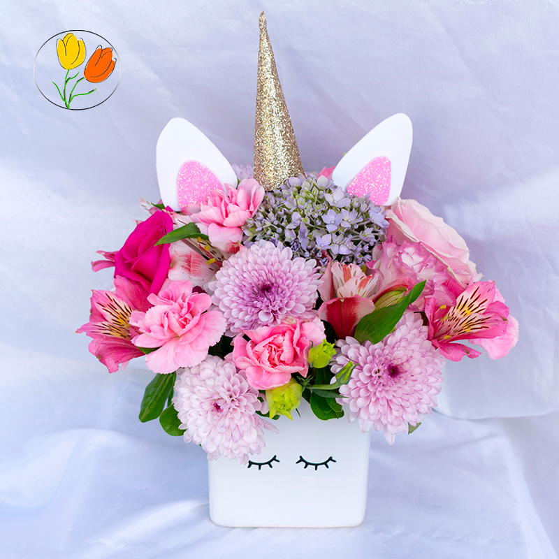 Hermoso arreglo floral elaborado en base de ceramica esmaltada con flores naturales y detalles con forma de unicornio.